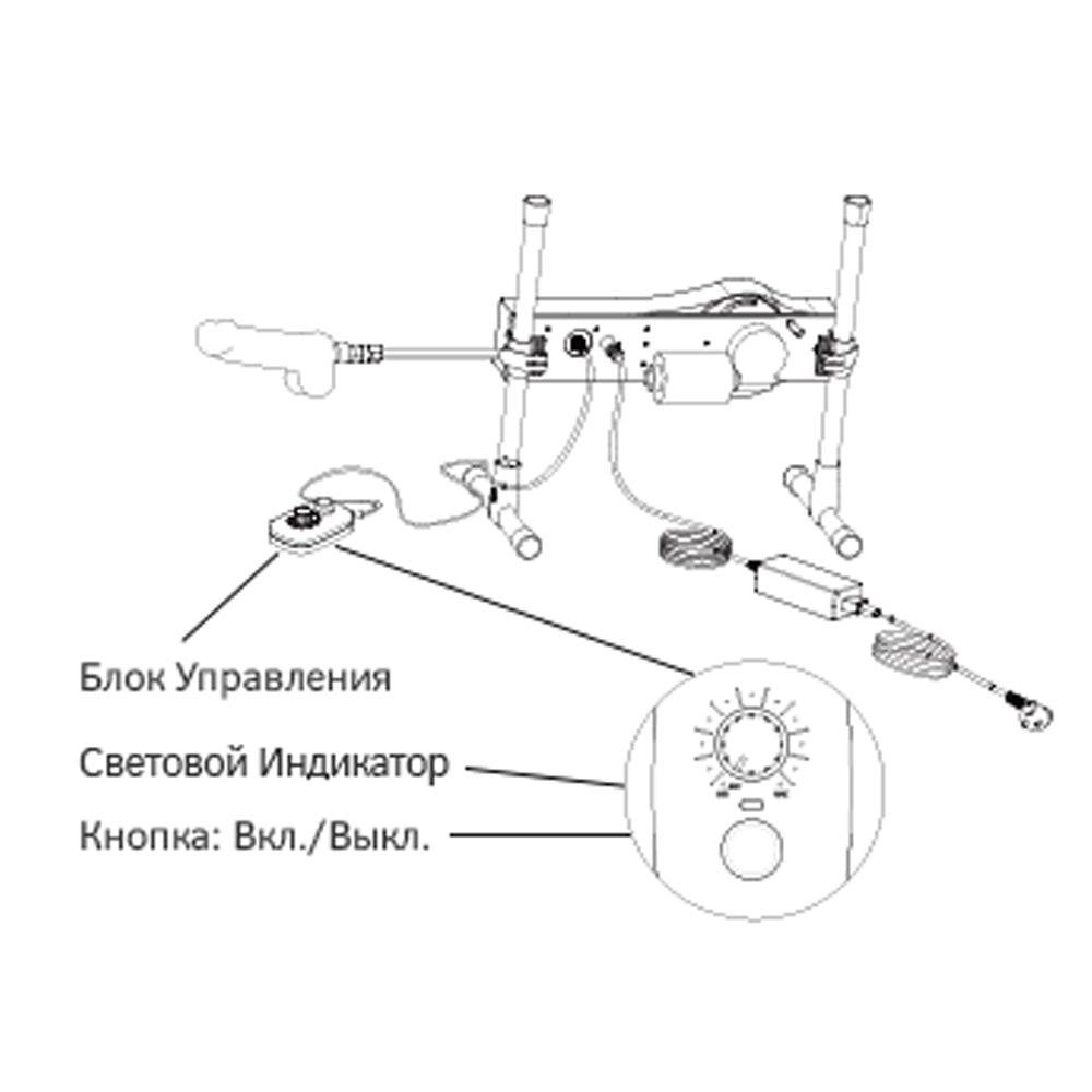 Соберите устройство согласно инструкции по сборке и подключите к электросети. Перед запуском проверьте, что регулятор скорости находится в положении «ВЫКЛ.». Для включения нажмите кнопку питания на блоке управления. После активации загорится и начнёт мигать световой индикатор, подтверждая готовность к работе.