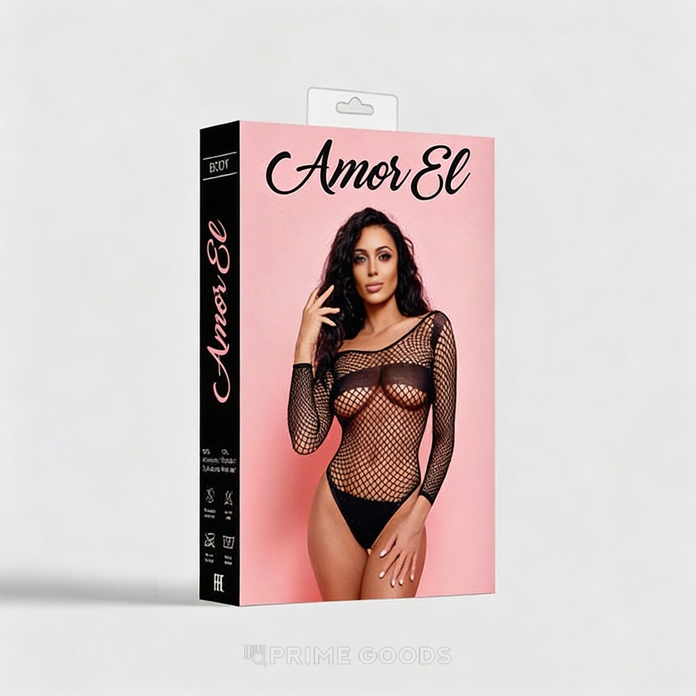 Изделие выполнено с длинными рукавами из мелкой сетки, а непрозрачная полоса в области груди деликатно прикрывает соски, создавая интригующий контраст с прозрачными участками. Эластичный материал идеально облегает тело, подчёркивая изгибы и достоинства силуэта. Зона спинки открыта, добавляя кокетливый акцент и визуальный эффект для прикосновений. Высокий вырез на бедрах демонстрирует ягодицы, делая образ ещё более эффектным.