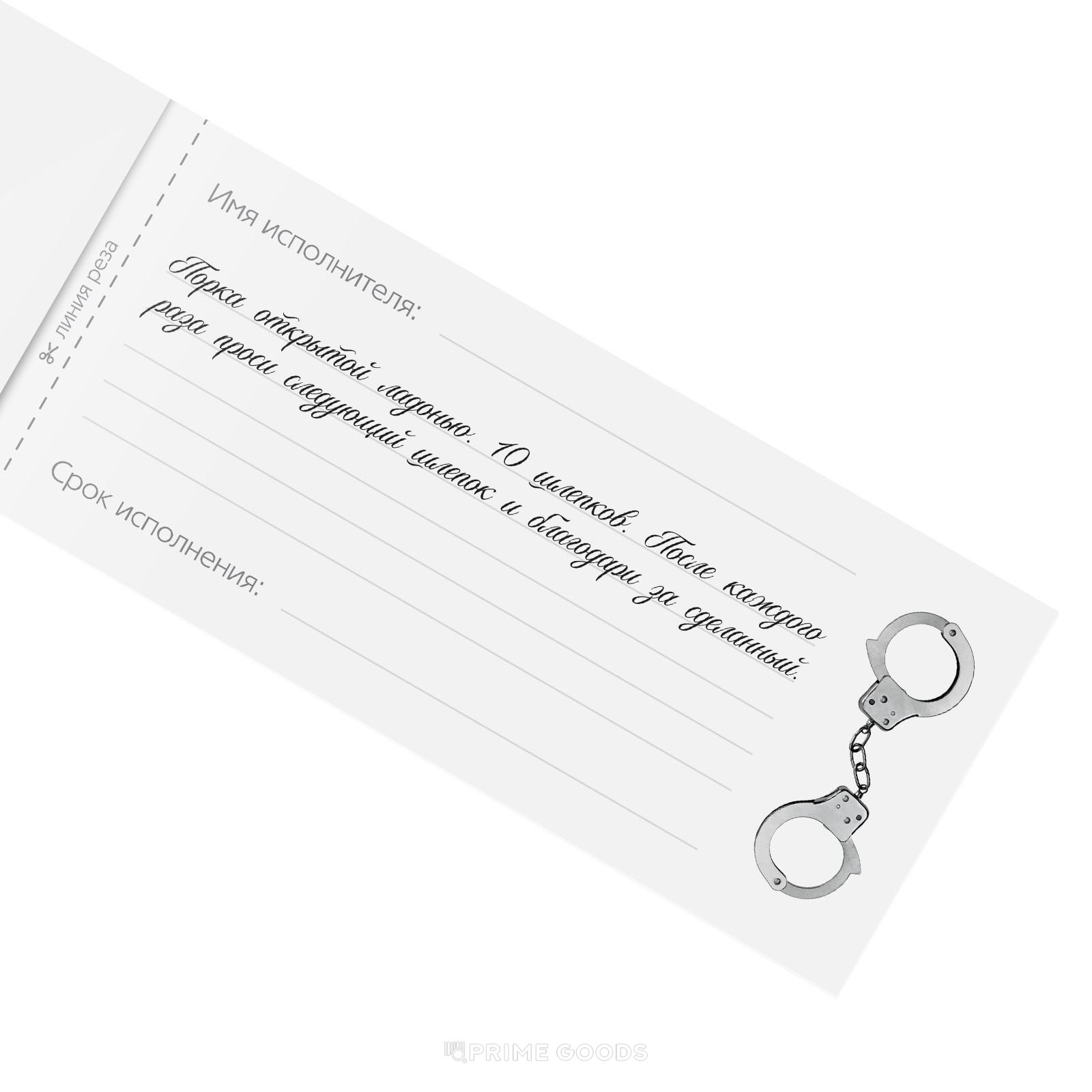 Прекрасный повод попробовать тотальный контроль и подчинение! Чековая книжка "Накажи меня" - это несколько чеков, которые содержат инструкцию для выполнения в стиле БДСМ. В случае если у Вас пока мало опыта или не уверены, что Вам или Вашему партнеру это понравится,то чековая книжка идеальный повод узнать это!