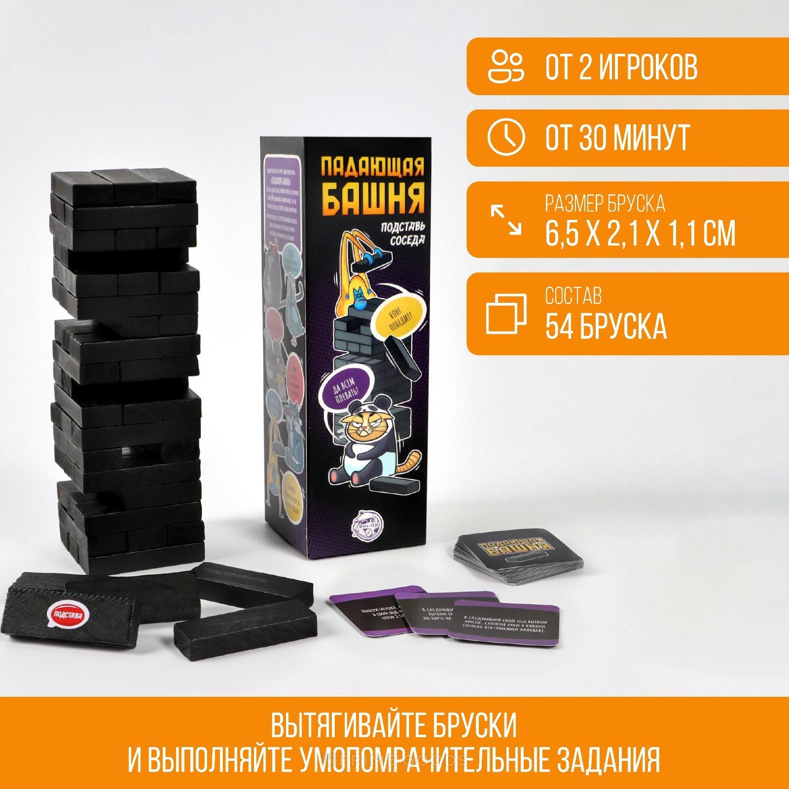 Игра подойдёт для дружеских встреч и вечеринок, когда хочется добавить азарта, смеха и неожиданных поворотов. Помимо привычных деревянных брусков, в наборе есть карты с заданиями-подставами, которые делают каждый ход ещё интереснее.