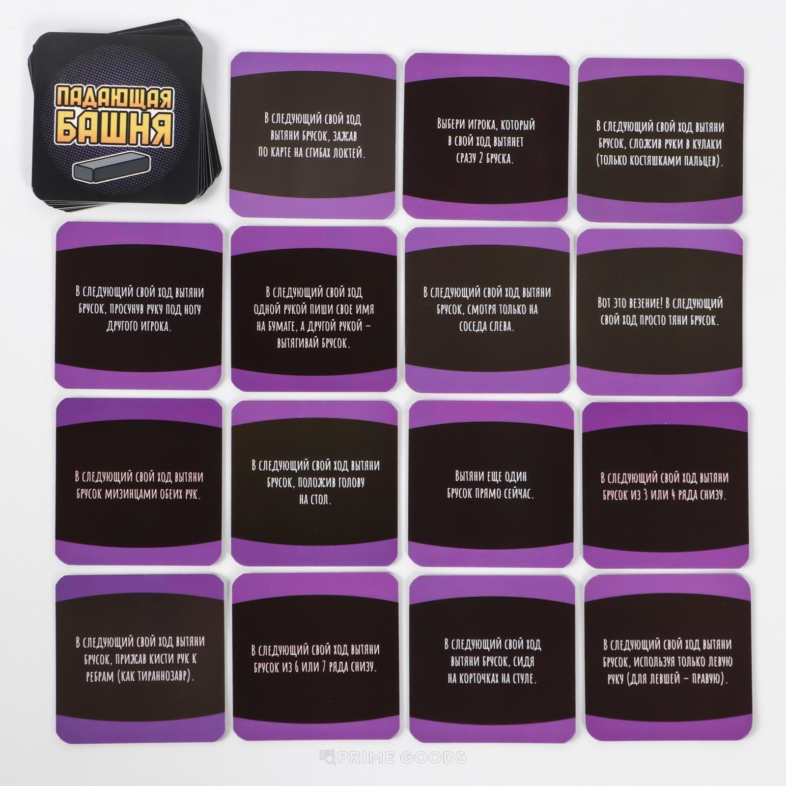 Игроки по очереди вытягивают бруски из башни, стараясь не уронить конструкцию. Но если попадается брусок с наклейкой — будьте готовы выполнить задание, которое может повлиять на ход игры или поставить в неловкое положение соседей по столу.