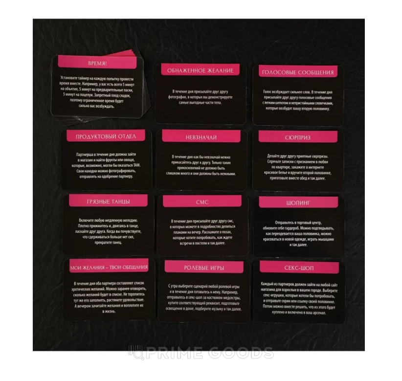 В наборе 20 карточек с оригинальными заданиями. Вытягивайте их по очереди, выполняйте без стеснения и позвольте игре увлечь вас в мир, где правят страсть и доверие. Здесь нет правил — только желание и взаимное удовольствие.