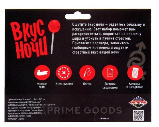 | В комплект входит | 2 рулетки, сценарий, плетка, атласная лента |