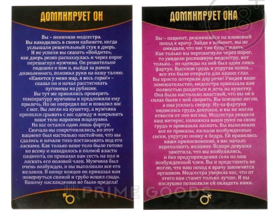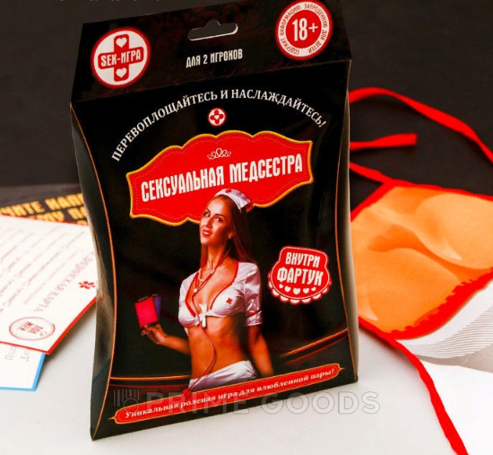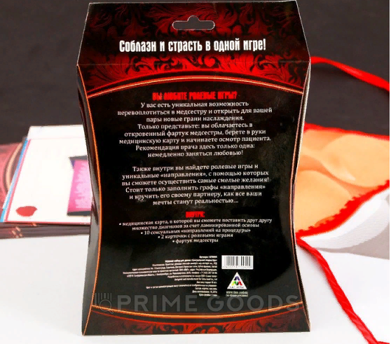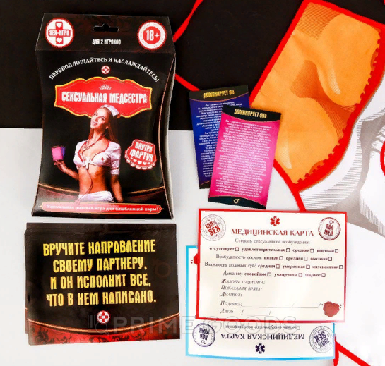Внутри вы найдёте: ламинированную медицинскую карту; 10 сексуальных «направлений на процедуры»; 2 карточки с ролевыми играми; фартук медсестры.