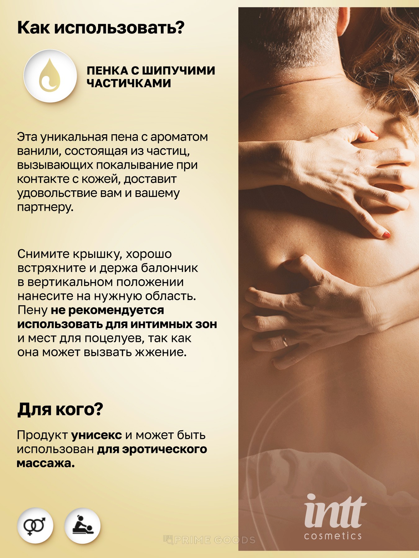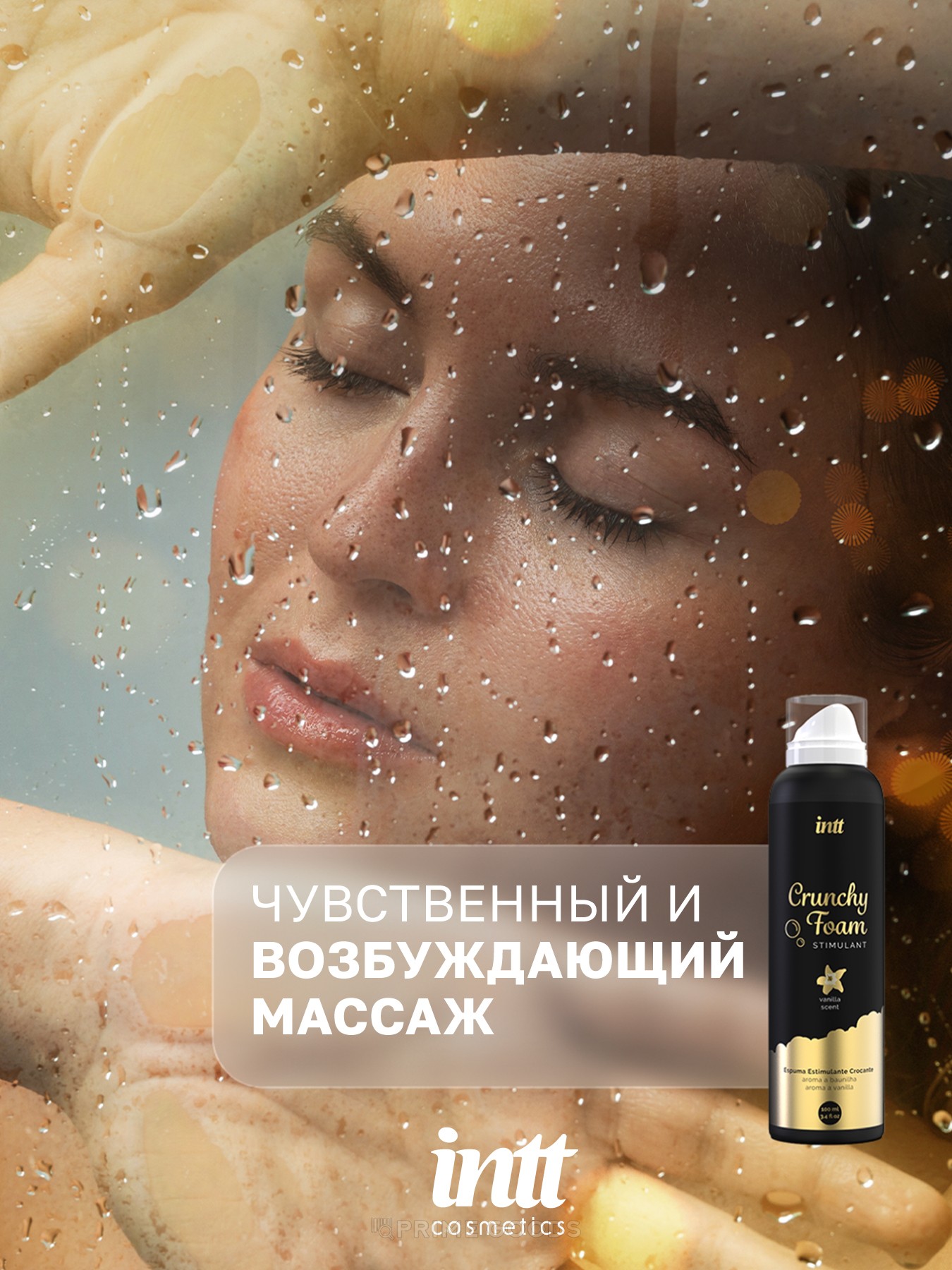Для интенсивных и возбуждающих эротических моментов выберите массажную пену Crunchy Foam от Intt. Эта уникальная пена с ароматом ванили, состоящая из стимулирующих частиц, вызывающих покалывание при контакте с кожей, доставит удовольствие вам и вашему партнеру.