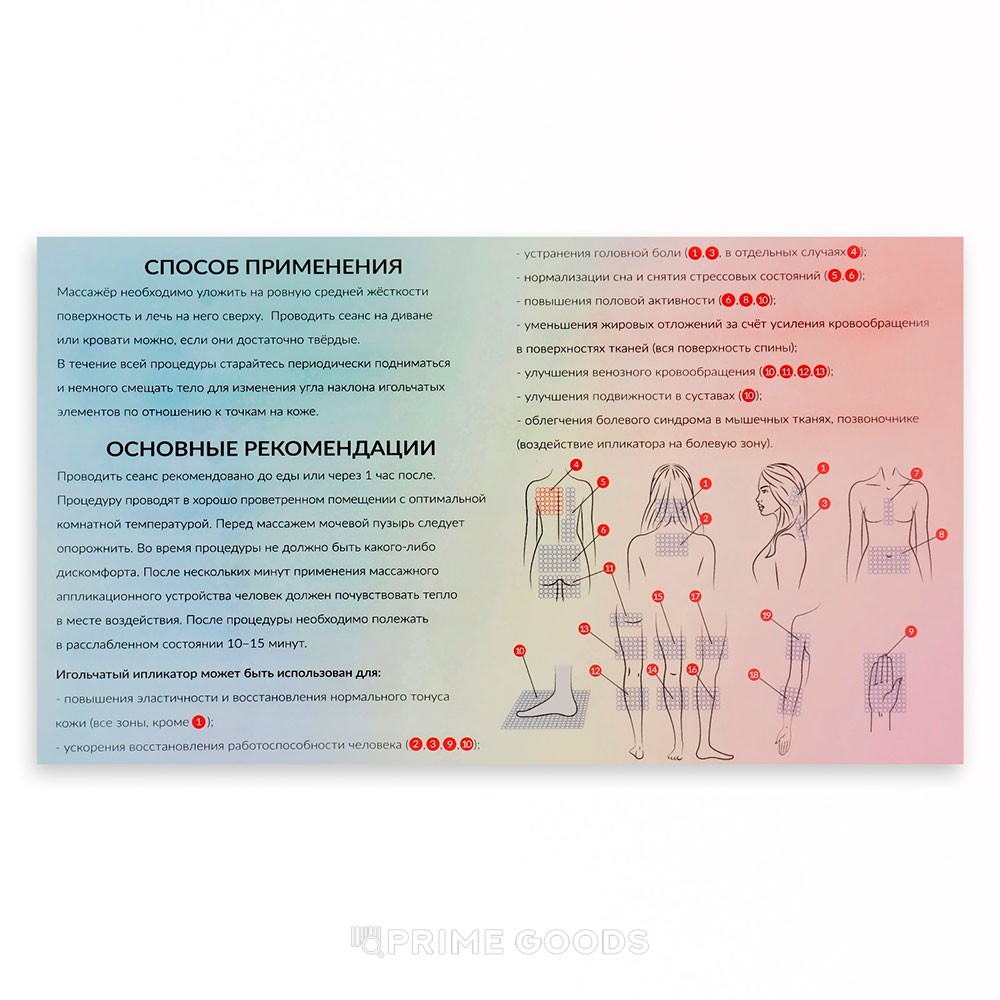 Регулярное использование ипликатор-коврика помогает повысить эластичность кожи и вернуть ей здоровый тонус, способствует быстрому восстановлению работоспособности и снижению усталости. Массаж области шеи и спины может облегчить головные боли, снять мышечное напряжение и улучшить подвижность суставов. За счёт усиления кровообращения в поверхностных тканях коврик также помогает уменьшить жировые отложения и улучшить венозный отток.
