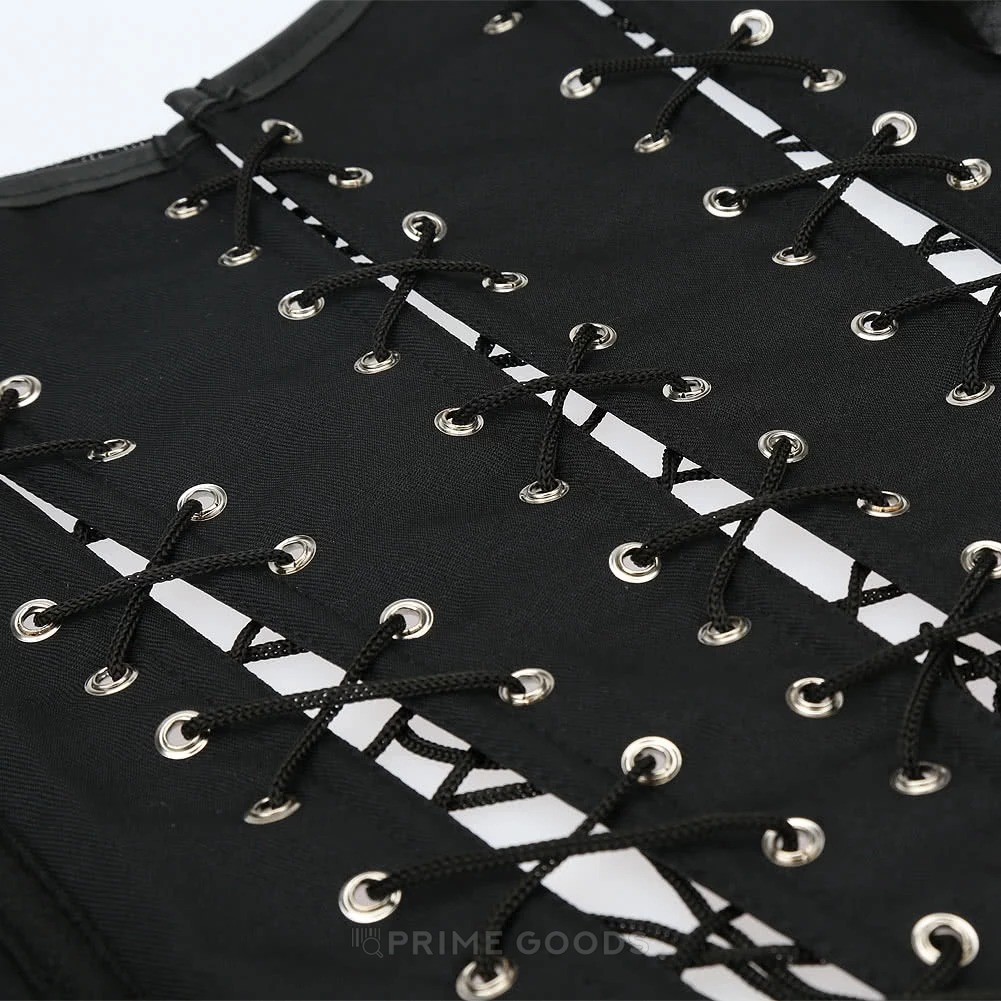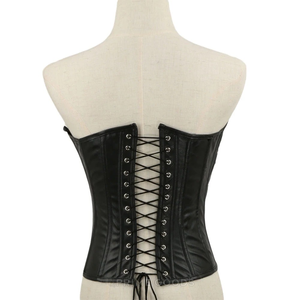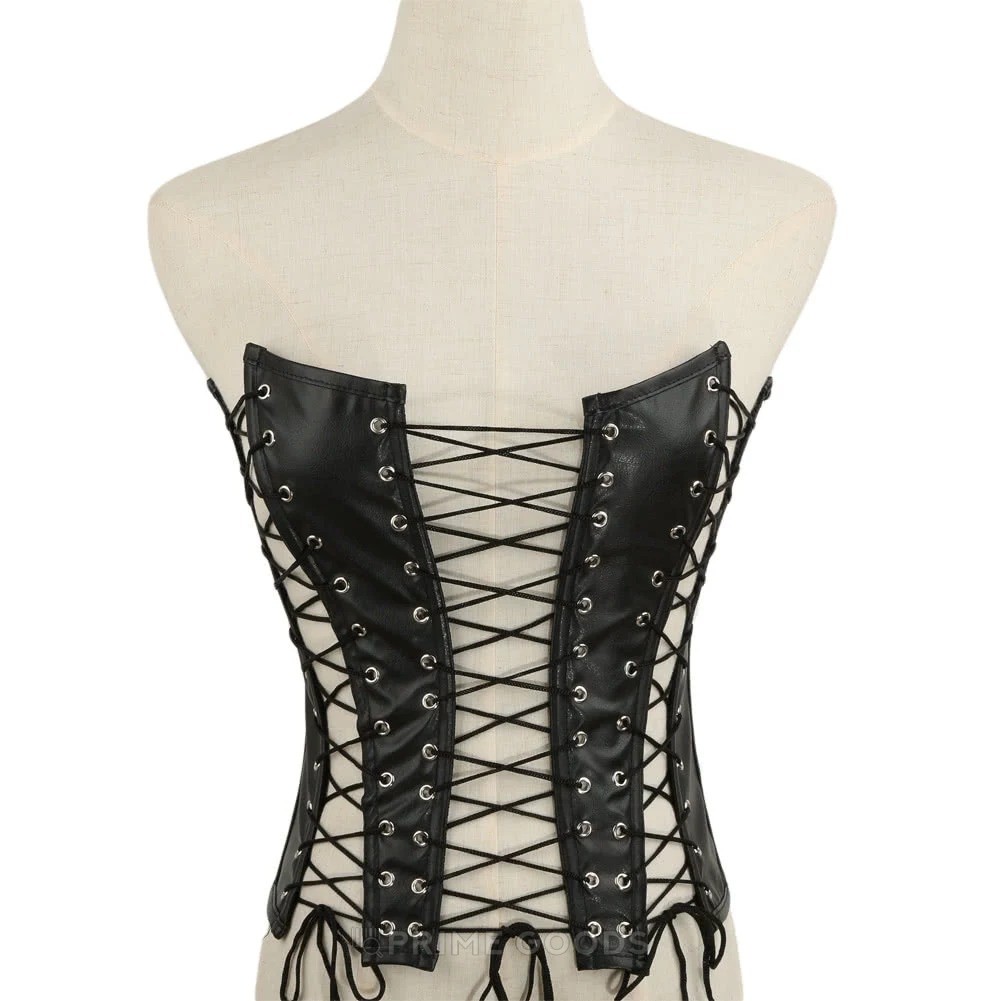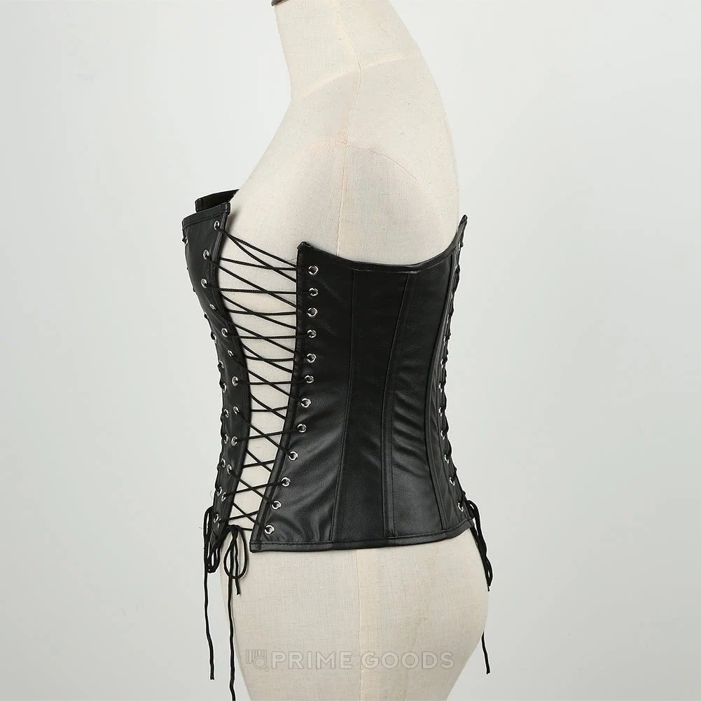 Дерзкий кожаный корсет, сделанный из нескольких фрагментов и собранных воедино шнуровкой, прекрасно садится на любую фигуру, ведь его можно как распустить, так и затянуть.