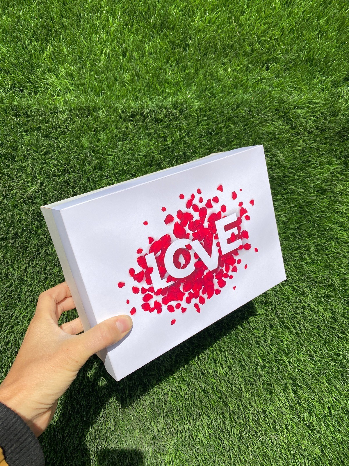 Коробка выполнена в белом цвете с ярким принтом в виде надписи LOVE, составленной из красных лепестков, образующих сердце. Контрастный дизайн сразу привлекает внимание и делает упаковку идеальной для подарков с эмоцией — любви, заботы и внимания. Белое дно подчёркивает аккуратность и премиальный внешний вид.
