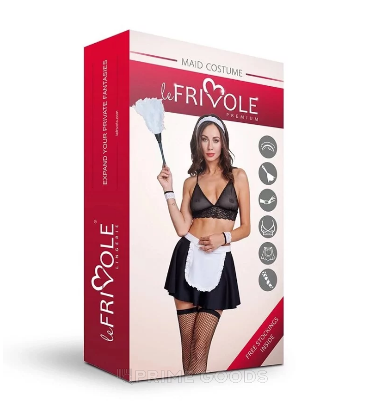 Короткая юбка с фартуком кокетливо открывает ноги и подчёркивает изгибы тела, а обтягивающее бюстье придаёт образу пикантности и подчеркивает формы. Манжеты и кружевной головной убор добавляют шарма, создавая идеальный баланс между невинностью и страстью. А перышко для пыли станет вашим главным оружием флирта, пробуждая фантазию и желание.