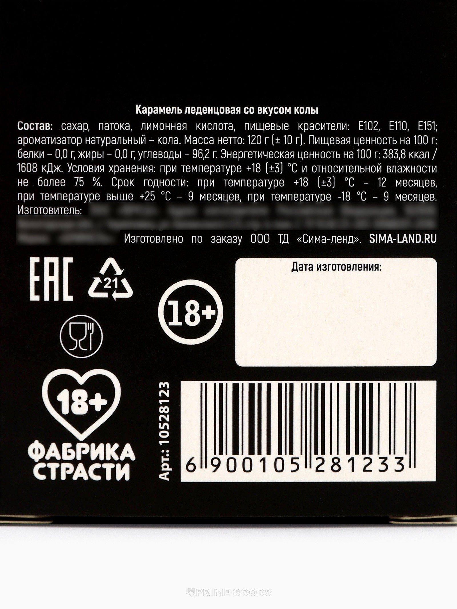 • ингредиенты: сахар, патока, лимонная кислота, натуральный ароматизатор «Кола», красители (E102, E110, E151)