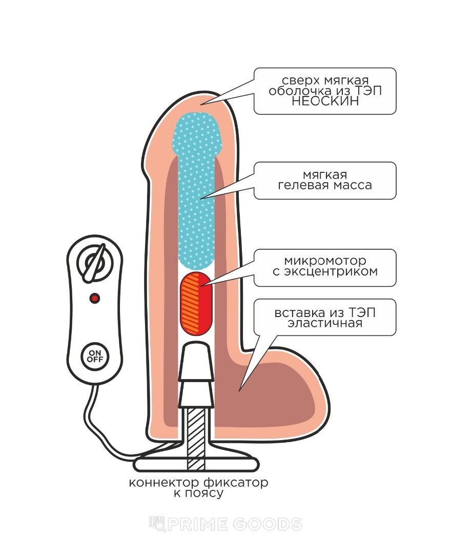 Изготовленная из высокотехнологичного неоскина с эффектом настоящей кожи, насадка дарит реалистичные ощущения благодаря двойной плотности, анатомической головке и упругому стволу. Мягкий внешний слой и гибкая структура позволяют девайсу принимать нужную форму. Мошонка добавляет визуального и тактильного реализма, а 12 режимов вибрации усиливают стимуляцию при каждом движении. В комплекте — коннектор для использования с трусиками для страпона.