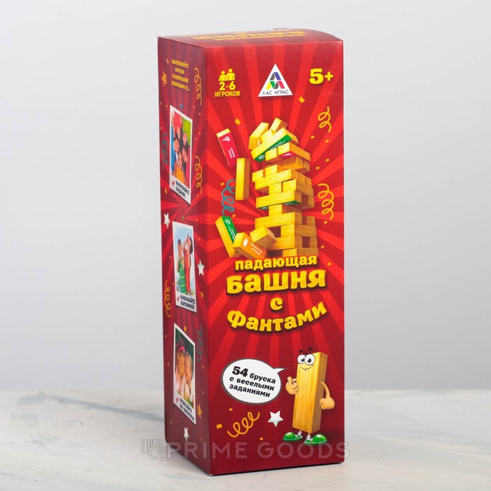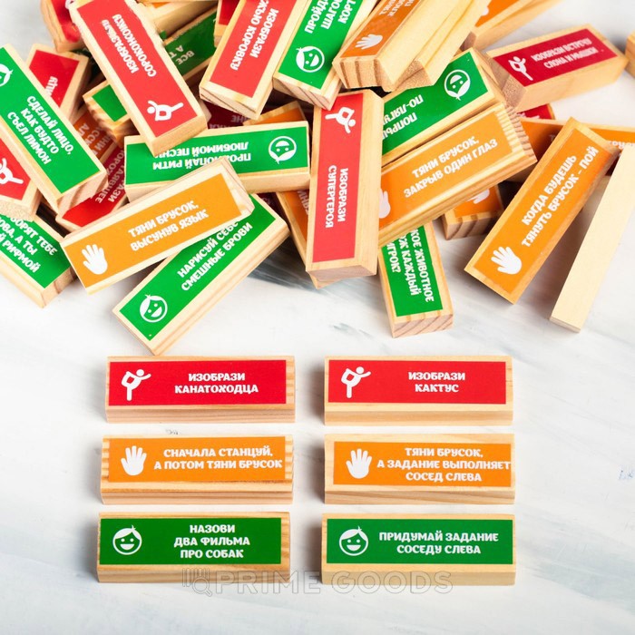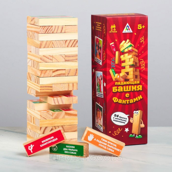 В коробке вы найдёте 48 брусков с фантами. Постройте башню, укладывая их в ровные ряды по три штуки. Вытягивайте бруски по очереди так, чтобы конструкция не упала. Вас ждут самые разные задания: предстоит изображать различных персонажей, тянуть бруски необычными способами и общаться с друзьями.