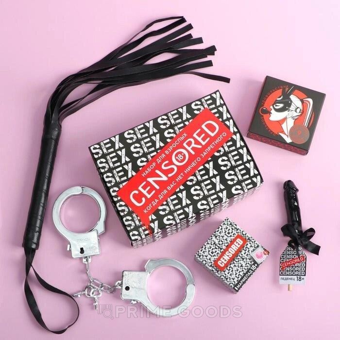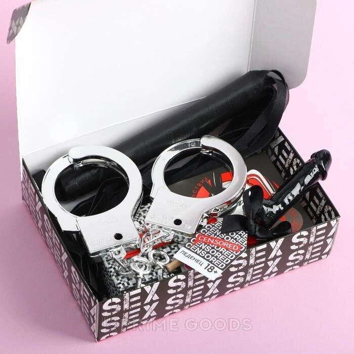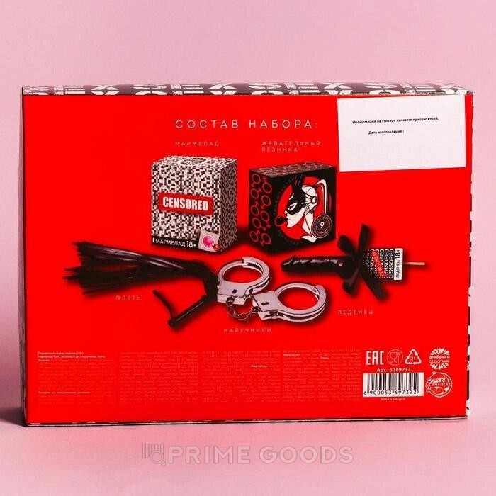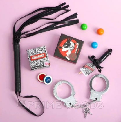 В комплект входит: леденец (30 г.), мармелад (4 шт.), жевательная резинка (9 шт.), наручники, плеть.