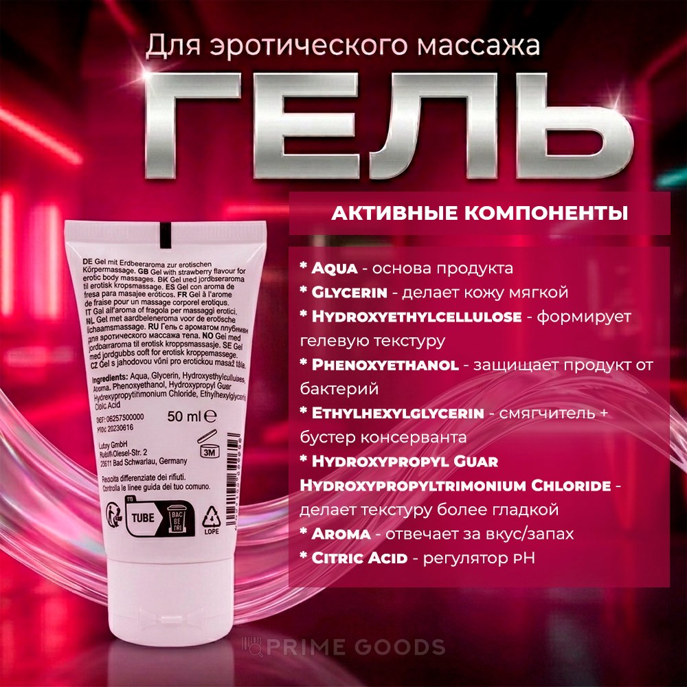 Гель обладает выраженным ароматом клубники, который дополняет массаж и создаёт приятную атмосферу. Лёгкая текстура не перегружает кожу и не оставляет следов на теле или текстиле. Формула подходит для использования на различных участках тела, включая чувствительные зоны.