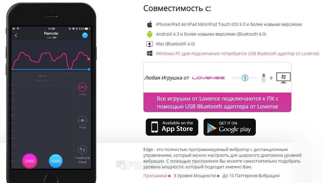 - Местное управление через Bluetooth (вы с игрушкой в кабинете, а партнерша из другой комнаты управляет массажером с помощью смартфона)