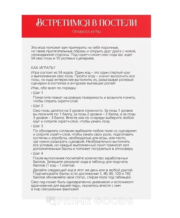 Под защитным слоем скрываются идеи, способные вдохновить даже самые опытные пары: 54 позы для удовольствия и 15 ролевых сценариев, которые помогут раскрепоститься и добавить в отношения щепотку азарта. Всё, что нужно — выбрать сектор, стереть покрытие и позволить игре начаться. Здесь нет правил и ограничений — только доверие, страсть и взаимное удовольствие.