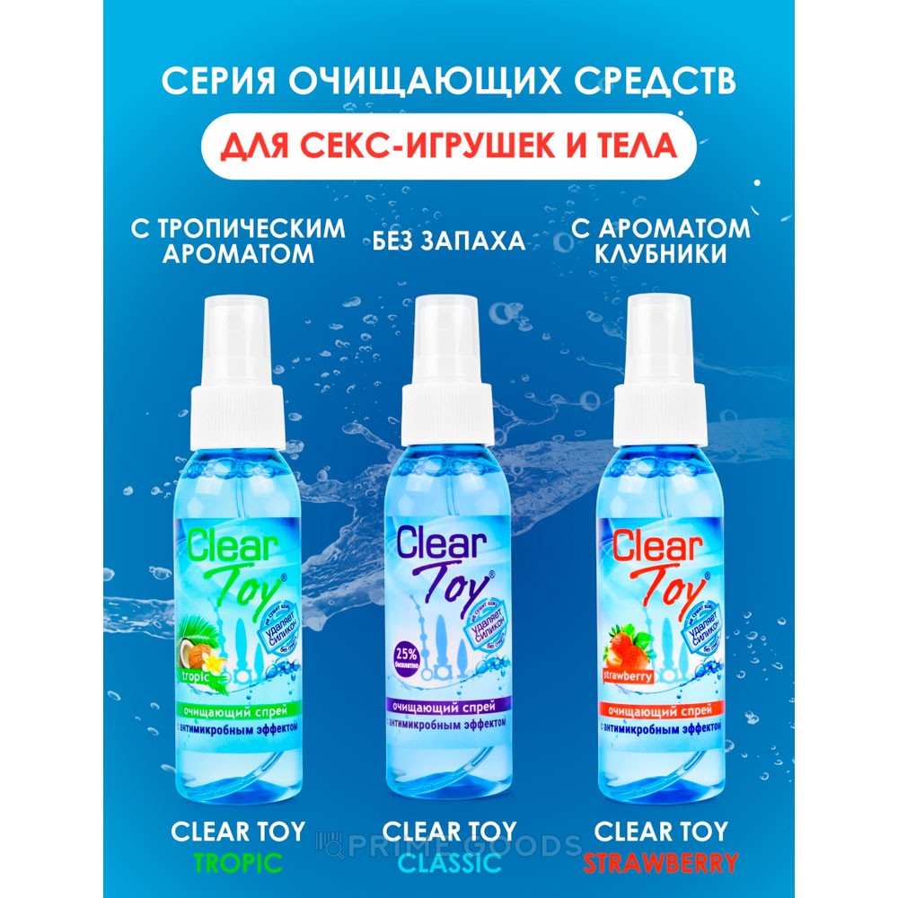 CLEAR TOY TROPIC — это спрей на водной основе с лёгким тропическим ароматом, созданный для быстрой и бережной обработки аксессуаров и кожи до или после близости. Его оригинальная формула с антимикробным эффектом обеспечивает надёжное очищение от различных загрязнений, включая следы силикона, при этом не повреждает поверхность и не сушит кожу. Средство дарит ощущение чистоты и свежести, помогает предотвратить появление неприятных запахов и сохраняет аксессуары в идеальном состоянии. Спрей совместим со всеми искусственными материалами, не содержит спирта и позволяет сократить время на обработку, оставляя только комфорт и лёгкость.