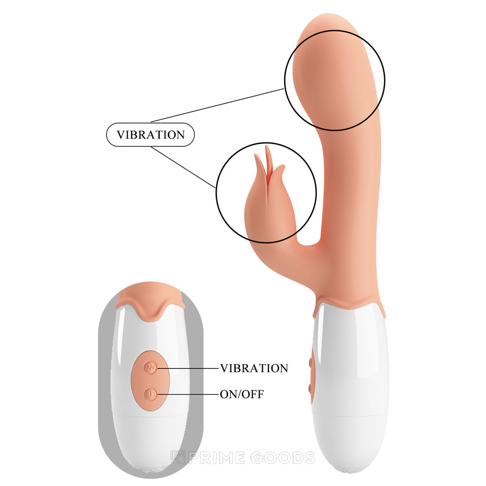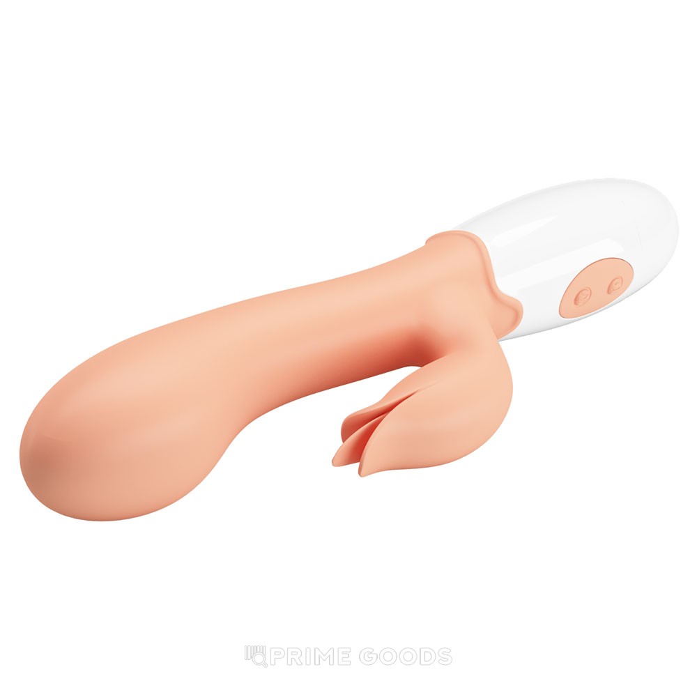 Вибратор выполнен из мягкого силикона телесного цвета. Один мотор расположен в изогнутом стержне с акцентом на точку G, второй — в клиторальном отростке в виде лепестка цветка. Такая конструкция обеспечивает точное попадание в самые чувствительные зоны, а 30 режимов вибрации дают широкий выбор от деликатной пульсации до мощных волн.
