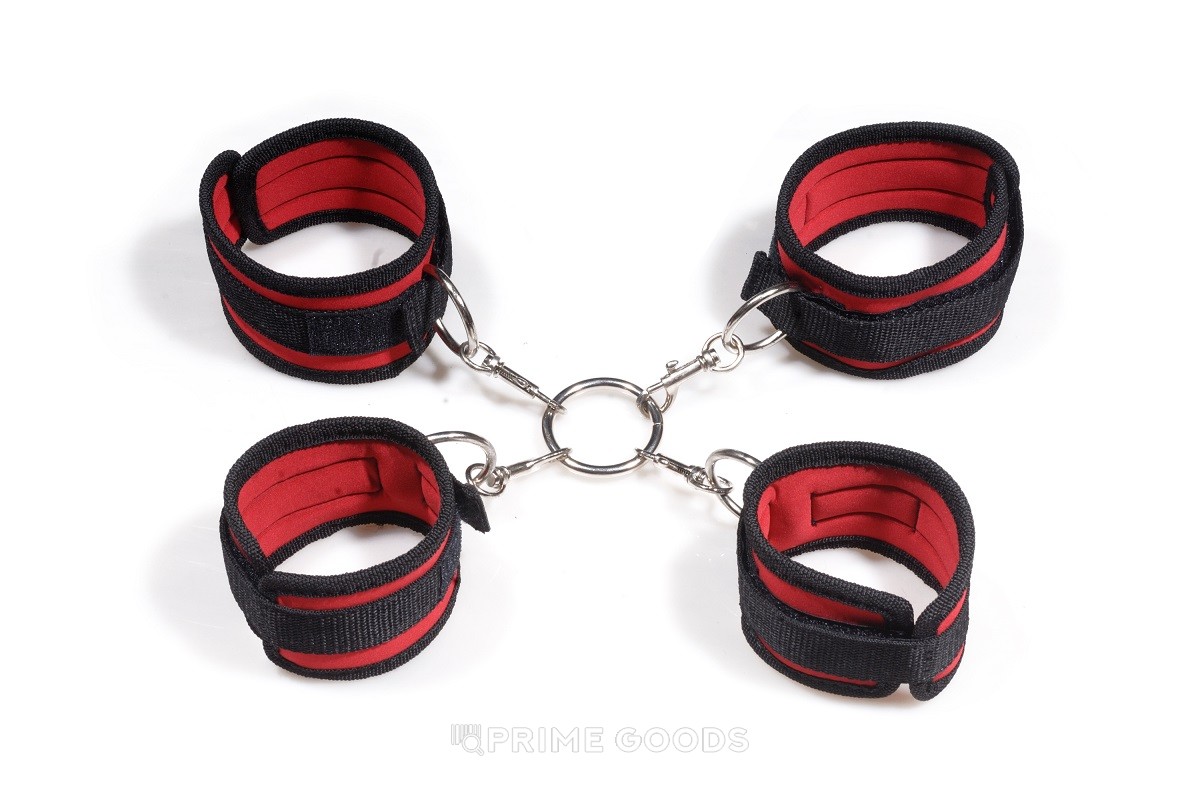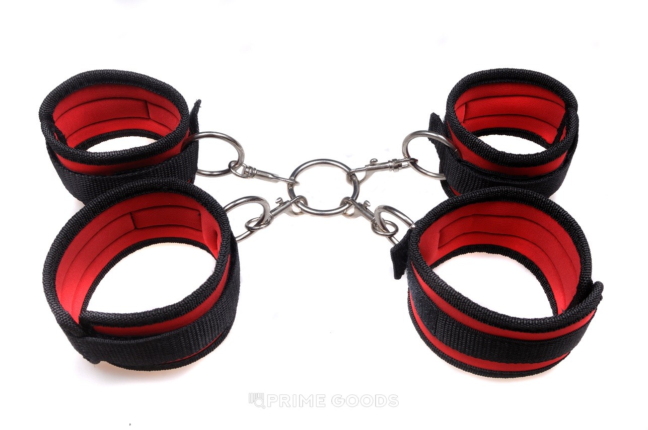 Две пары мягких манжет, соединенные между собой кольцом, позволят вам ограничить движения своего партнера. Манжеты на липучках сделаны из красно-черного нейлона. При желании любую из манжет можно отстегнуть.